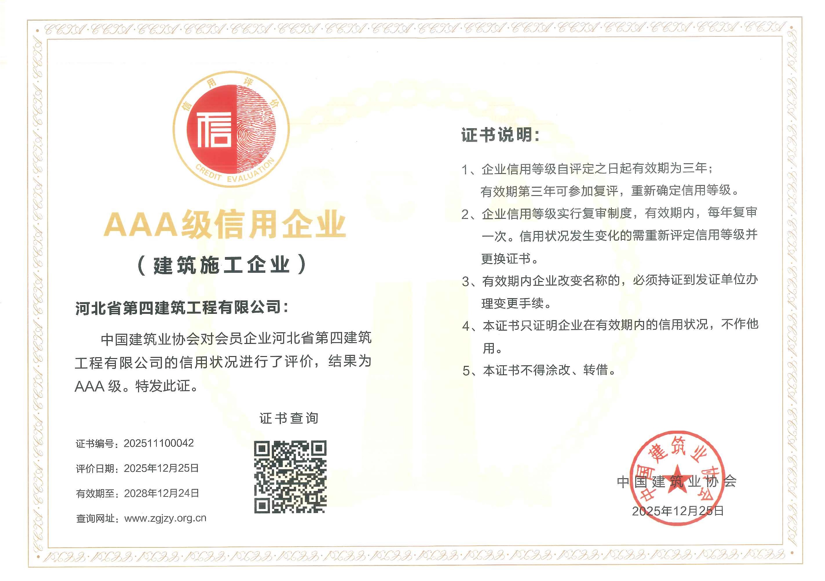 河北四建:河北省建协AAA企业信用等级证书