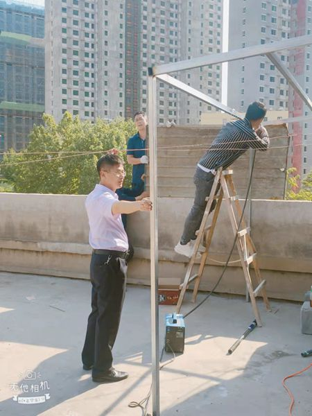 说干就干,立即行动。刘保国和左建华对楼顶平台实地量测,记录好尺寸。两人一边量着,一边比划着,对所需的材料做到心中有数。“采购材料的事儿,就交给我了。”设备材料科科长史永涛拿出电话就开始联系起来。材料就位后,考虑到有些电焊的活儿需要专业的工人,刘保国赶紧联系了一名电焊工。大家分工合作,你递材料、我扶钢管,你安装、我绑线,边干边聊。30多度的高温下,大家的额头上直冒汗,但干劲儿丝毫没减。防雨棚安装完毕,新买的洗衣机放置到位,大家松了一口气。“今天的大工程结束了,趁着这次机会,咱们把宿舍的门窗都检查一遍。”刘保国说道,抬手擦了擦汗水,便拿起工具向宿舍走去。大家对宿舍的门窗逐一进行检查,对破洞的纱窗进行了更换,对门上松动的把手进行了维修。