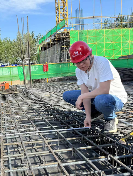 在抢抓进度的同时,史惊涛深知质量是项目的生命线。他带领团队狠抓质量控制,实现过程精品、一次成优,定期召开“质量分析会+作业面交底会”,严控每一个环节、精研每一道工序,尤其是在地下室施工钢筋绑扎阶段,钢筋间距密、数量多,柱插筋、集水坑钢筋要求位置精确,施工难度较大,他认真分析质量控制重点和难点,进行专项攻关,结合现场实际情况反复推敲施工方案,按照图纸设计间距,在基础垫层上弹好钢筋位置线,绑扎时严格按照位置线进行柱插筋及集水坑钢筋的放置及绑扎,墙筋采用水平和竖向定位筋,确保绑扎牢固,间距均匀,纵横成线。