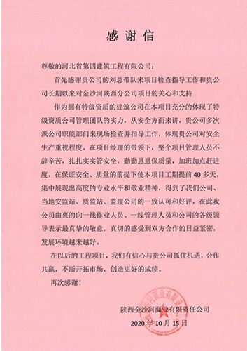 10月22日,四分公司收到陕西金沙河项目部业主单位致公司的感谢信和锦旗,以及武功县住房和城乡建设局、监理单位赠送的锦旗。