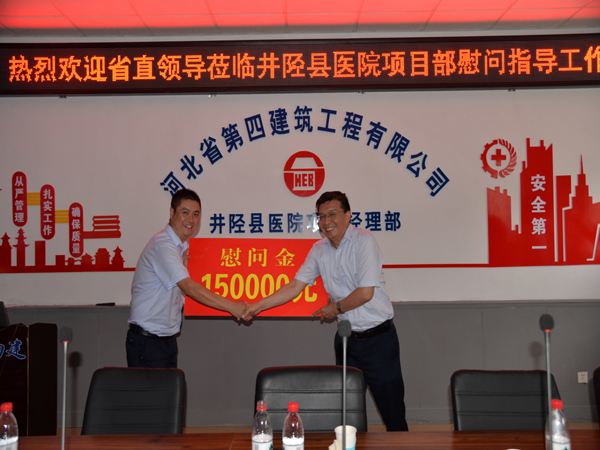 7月26日下午,河北省直工委副书记范金龙一行到二分公司井陉县医院项目部,对奋战在一线的职工进行暑期慰问,为他们送来了慰问金和慰问品。集团工会主席王文利、公司党委副书记、纪委书记、工会主席李怀生、二分公司党总支书记孙立锋一同参加。