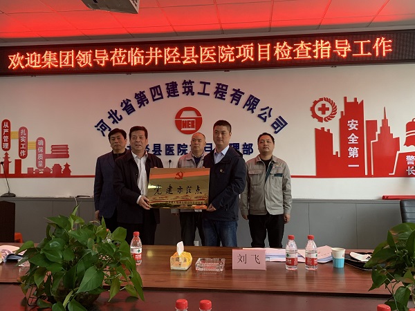 10月27日,集团党委副书记张庆虎、党委组织部部长张秋英、党委组织部刘飞等一行三人到省四建二分公司井陉县医院项目党支部进行党建示范点验收授牌。公司党委副书记、纪委书记、工会主席李怀生,党委组织部部长王彦森,分公司党总支书记孙立锋一同参加。