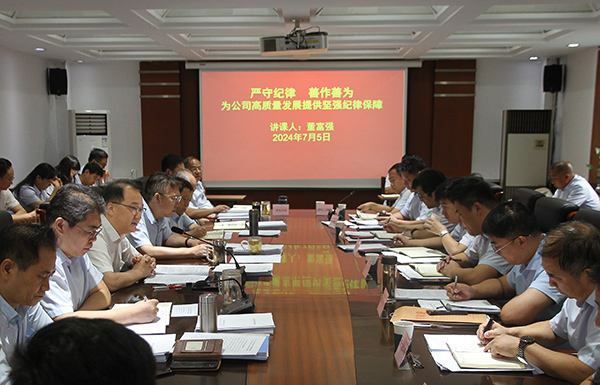 7月5日上午,公司党委书记、董事长董富强在三楼会议室讲授主题为“严守党纪,善作善为,为公司高质量发展提供坚强纪律保障”的专题党课,公司领导班子成员、各部室负责人以及各分公司书记、经理加了学习