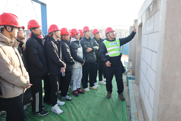 下午14:00,活动准时开始。活动分为实地参观和座谈两个环节。参观前,项目经理李士宁为大家进行了安全教育培训。随后,李士宁将学生分为质量、技术、安全三个组别,由相关人员带领到现场参观。参观过程中,相关人员围绕项目生产经营情况,深入浅出地向师生们讲解了技术管理、质量管理、安全管理方面的知识,同时回答了学生们的提问。在参观医疗康复楼的时候,学生们好奇地问“这是什么?”项目技术负责人告诉他们那是盘扣式脚手架,并介绍了组成架体的构件。学生们纷纷表示,这样“零距离”参观,不仅有助于把理论知识和实践应用相结合,更让他们了解到了最前沿的施工技术,同时感受到了河北四建公司正规化、标准化的管理,受益匪浅。