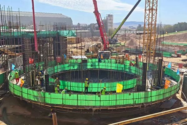 全体职工以昂扬斗志和实干作风,抢抓施工黄金期。在生料均化库的施工现场,一场惊心动魄的“滑模攻坚战”正成为项目建设的焦点。生料均化库作为项目核心储料设施,施工精度要求较高,库体垂直度误差需控制在毫米级,模板支护和混凝土浇筑难度远超常规工程。项目主管工程师带领管理人员,白天实测数据、勘察作业面,晚上对照南非当地规范和国际标准,反复测算模板支护的受力参数,优化浇筑方案。为确保施工精度,每次浇筑前,他会组织相关人员逐一排查支架、模板的受力点分布情况,同时采用高精度定位仪实时监测,创新采用“智能测控、定向分析、实时调整”工艺,严格控制混凝土配合比和浇筑速度,确保库体垂直度的精准。